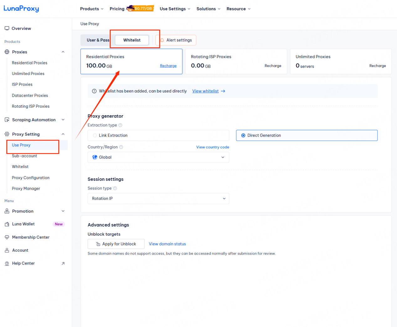 Step 3: Click [Use Proxy] → [Residential Proxies], select [whitelist]