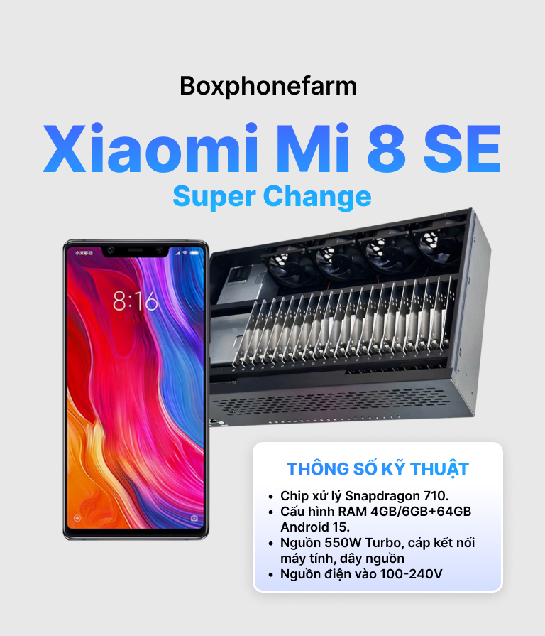 Xiaomi Mi 8 SE Super Change là dòng boxphone thế hệ mới 2025, được GenFarmer phát triển dành riêng cho những nhà vận hành chuyên nghiệp, muốn farm tài khoản với độ ổn định, an toàn và tuổi thọ lâu dài.